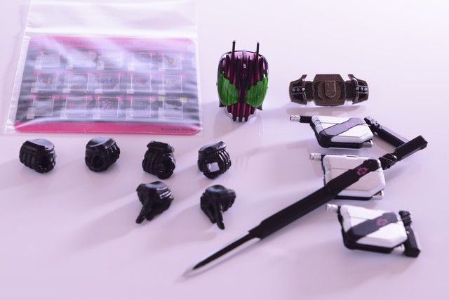 付属品。交換用バックルとライダーカード、ライドブッカー各種と激情態フェイスと手首(開き手は割愛)。