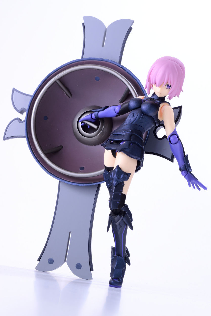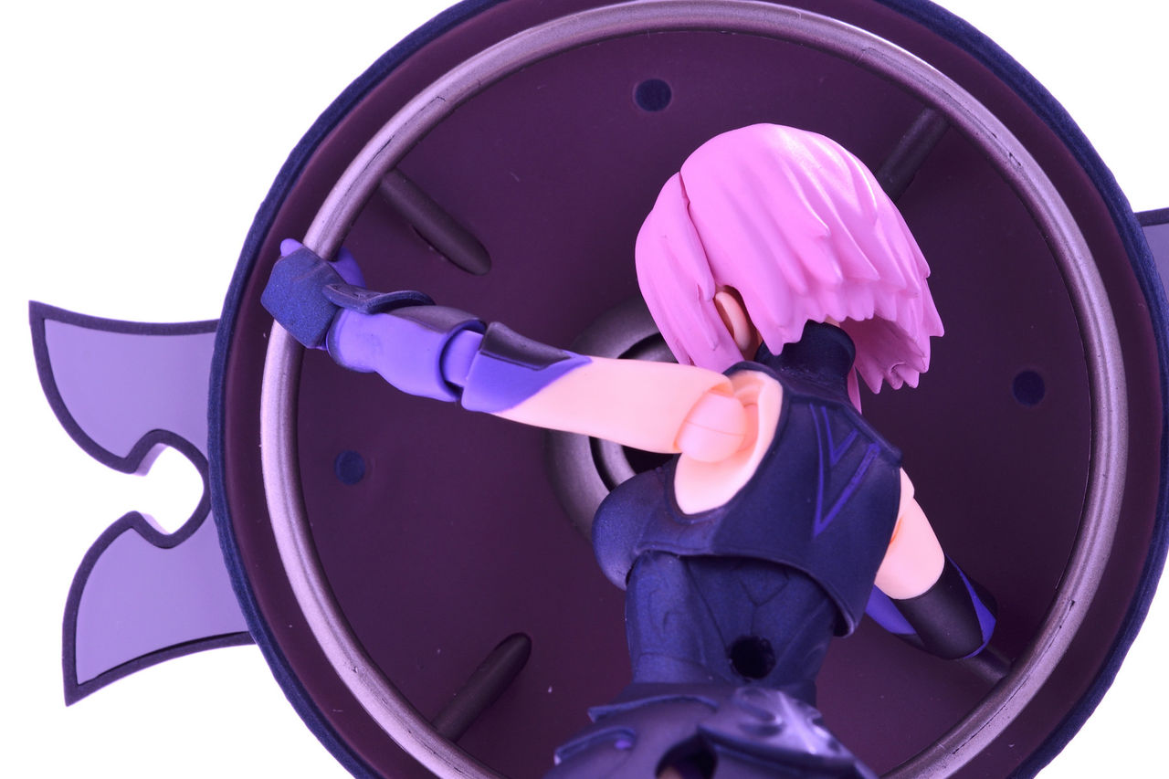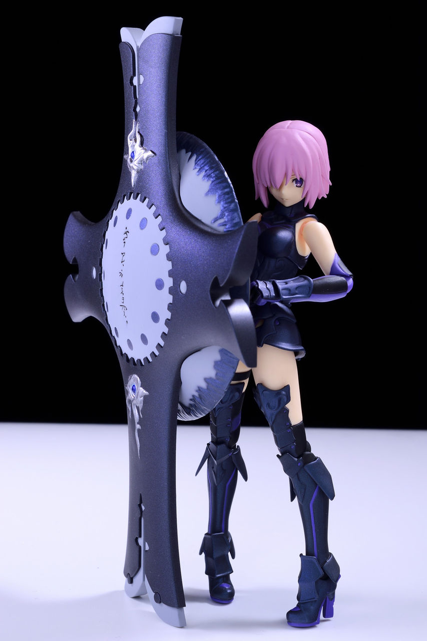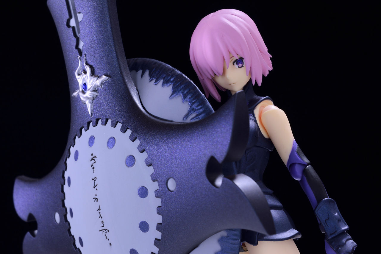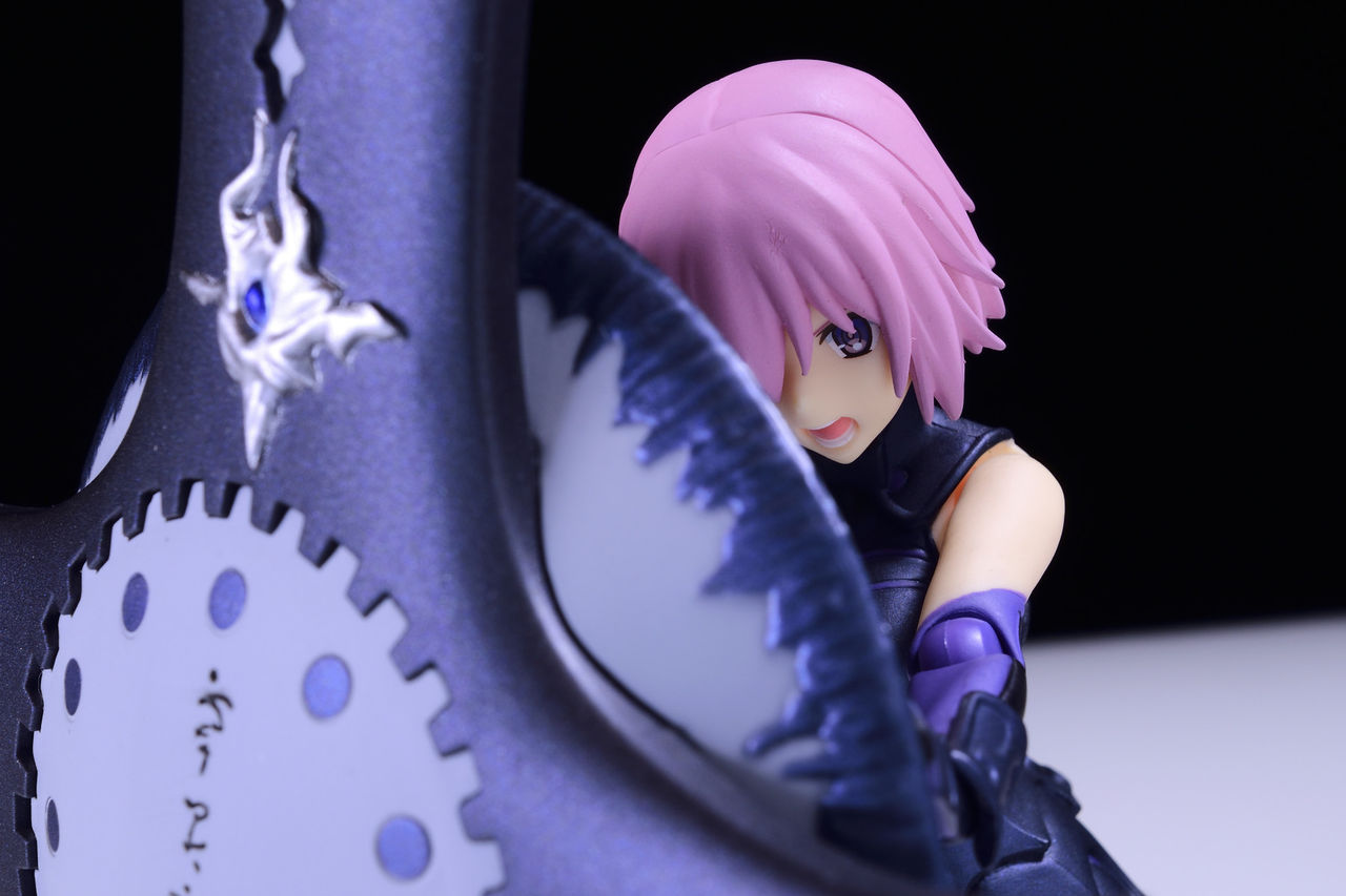 マシュをデミ・サーヴァントたらしめる十字架型のラウンドシールドも細部まで再現されており、設定同様、躰よりもデカいというスケール感を損ねておらず良い具合。